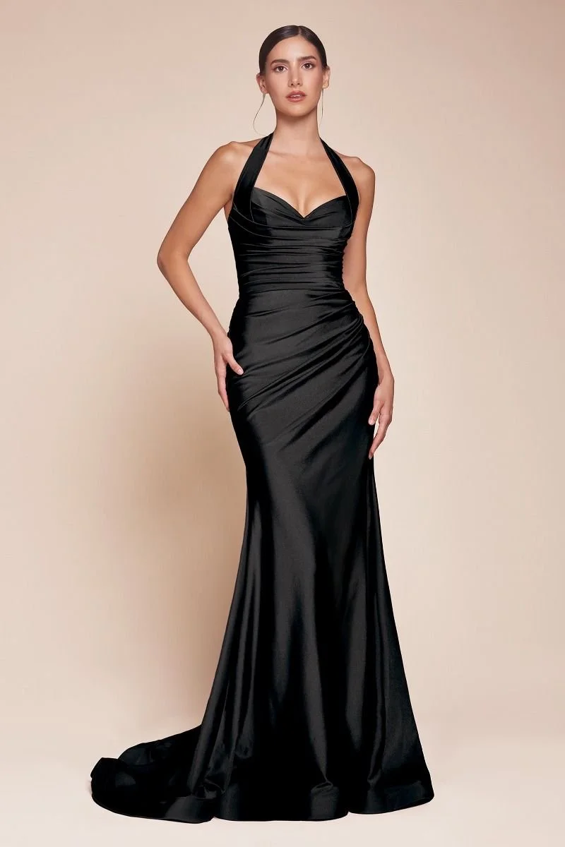 Look breathtaking in this satin long halter dress with a fitted slit skirt from Ladivine by Cinderella Divine CD796. Elevate your elegance with this fitted stretch satin dress, featuring a halter sweetheart neckline and a gathered waistline. The design is enhanced by a sophisticated leg slit, providing a touch of allure and ease of movement. Perfect for bridesmaids or formal events, this dress ensures a flattering and graceful silhouette for any special occasion.
